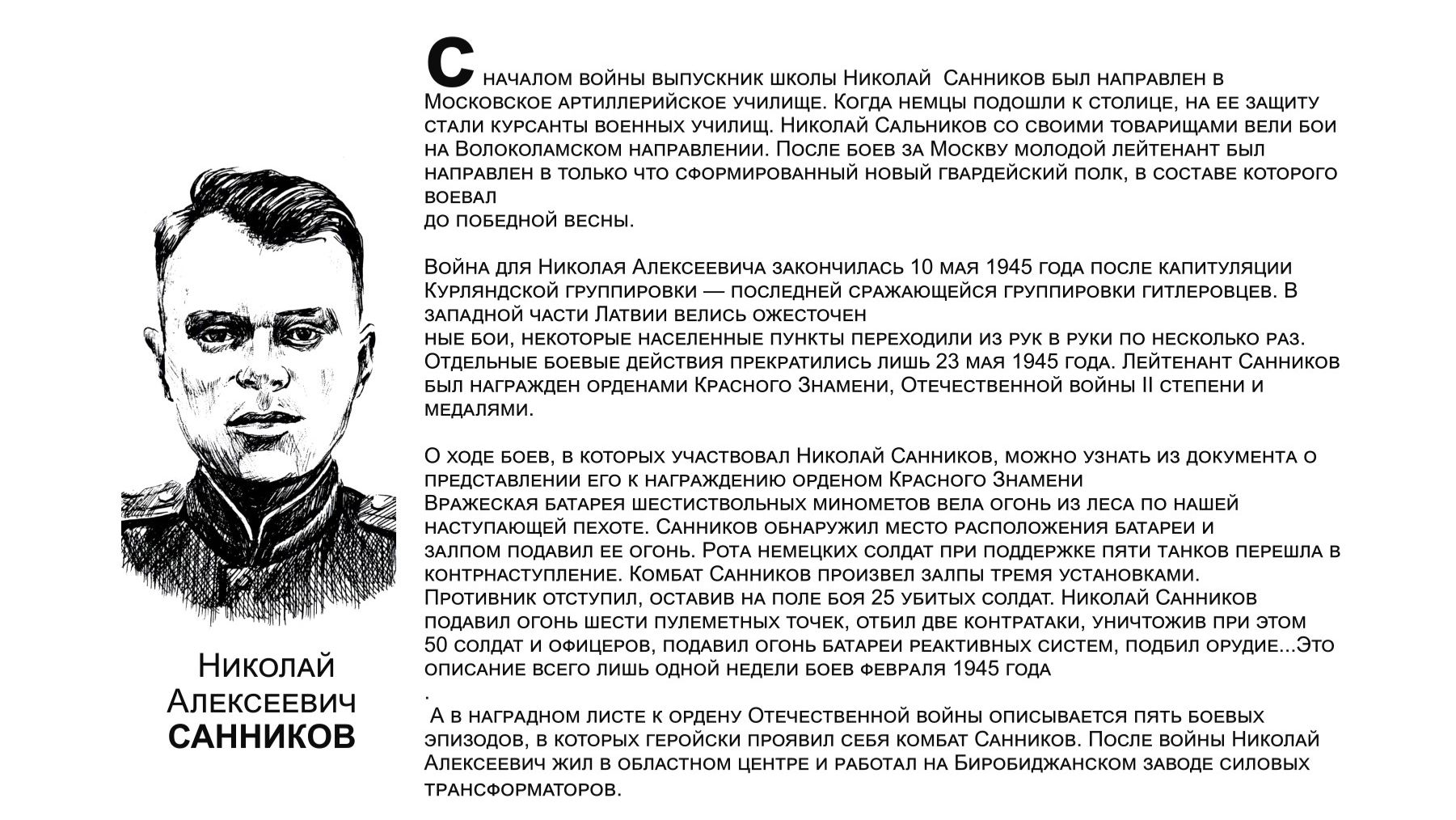 В годы Великой Отечественной войны на фронт ушли более 11 тысяч жителей ЕАО, семь тысяч наших земляков погибли или пропали без вести. Те, кто вернулись, прожили достойную жизнь. Они строили дома, выращивали хлеб, учили детей, стояли на охране правопорядка. Этим людям мы посвящаем нашу галерею "Бессмертный взвод". Среди героев - Николай Алексеевич САННИКОВ