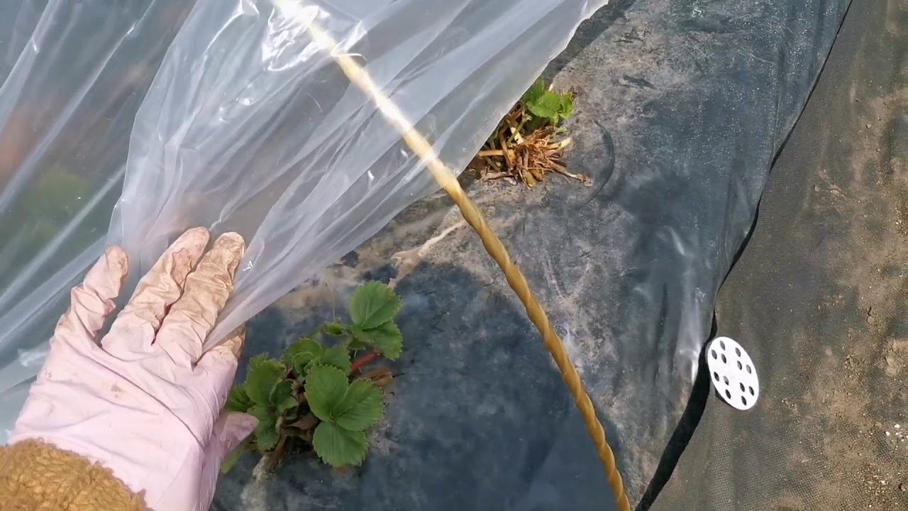 Натягиваем пленку на дуги для клубники.