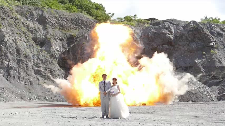 В Японии супружеская пара устроила свадебную фотосессию со взрывами у себя за спиной. Даже когда пиротехнические заряды сдетонировали и вспыхнуло пламя, герои остались неподвижными и сохранили полное спокойствие.