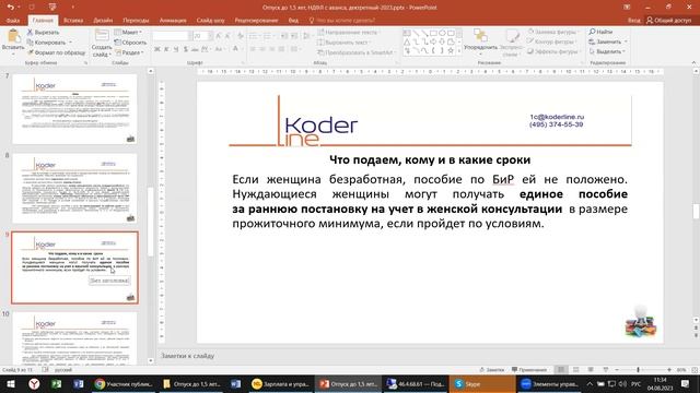 Компания «Кодерлайн» провела вебинар «Отпуск до 1,5 лет, НДФЛ с аванса, дектретный-2023 на примере 1С:ERP 2.5 и 1С:ЗУП» Ведущая: Гардышева Галина - консультант-аналитик 1С:ЕRP Целевая аудитория для бухгалтеров, пользователей и специалистов ИТ-подразделений компаний различных отраслей.  Описание В 2023 году изменились почти все формы налоговой отчетности, введены в действие новые правила, внесены поправки в уплату НДФЛ –как теперь должны оформляться первичные документы разбираемся вместе на примере 1С:ERР и 1С:ЗУП. Программа 1. Что изменилось за первые пол года в правилах оформления декретных; 2. Что подаем, кому и в какие сроки; 3. Пособия по уходу за ребенком до 1.5 лет; 4. НДФЛ, совмещение, неполный рабочий день на период отпуска по уходу за ребенком; 5. Доп. Сервисы.