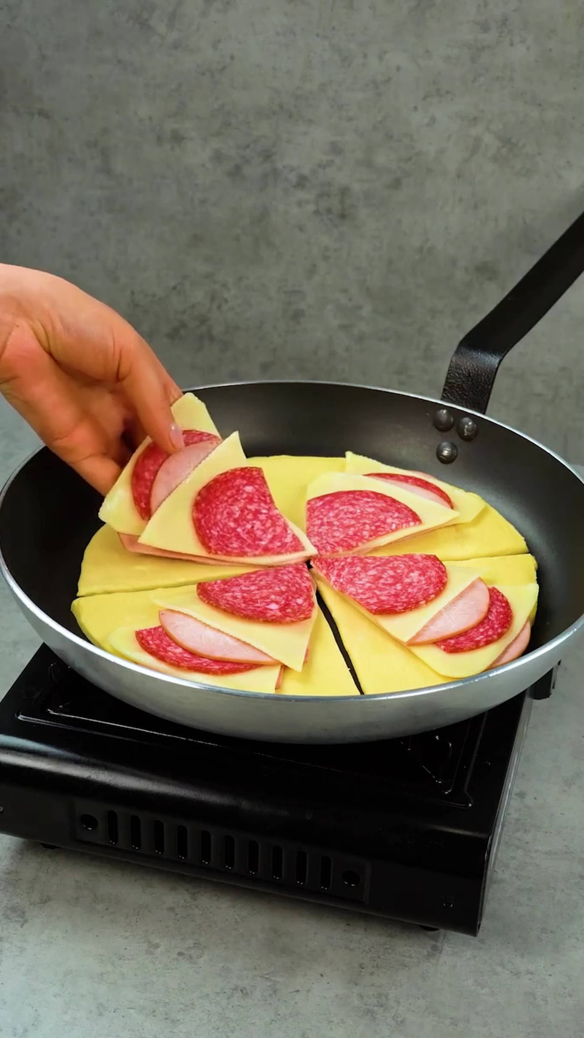 Забудьте о пицце! Лучшая закуска из слоеного теста без выпечки Ингредиенты: растительное масло: 10 мл слоеное тесто: 600 г томатный соус: 100 г соль: 3 г орегано: 1 г ветчина : 150 г сыр : 150 г колбаса: 150 г моцарелла : 100 г яйца : 1 шт острый соус: 30 г уксус : 20 мл растительное масло: 150 мл соль: 3 г черный перец: 2 г сладкая паприка : 2 г