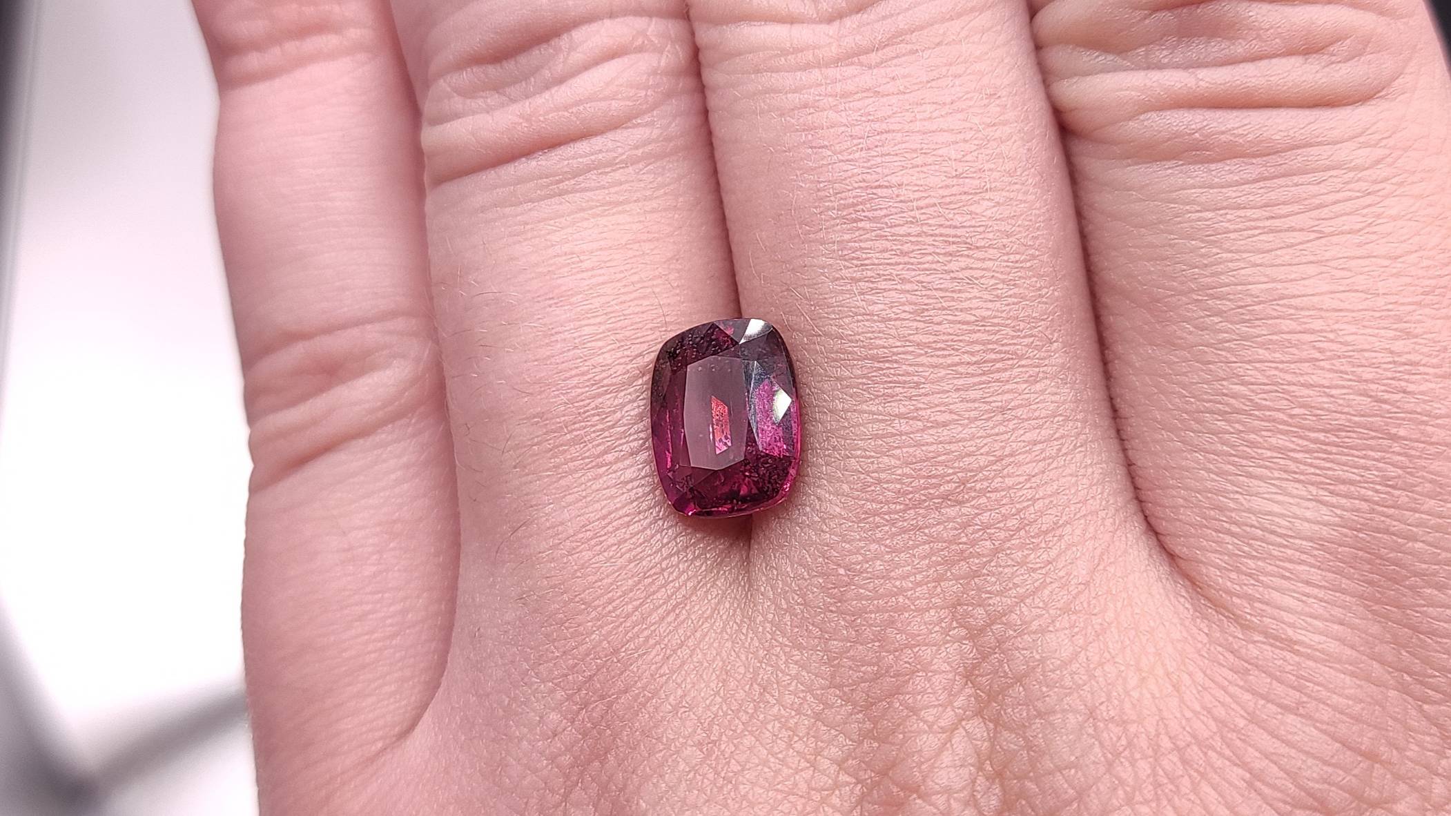 Гранат Родолит, кушон 4.12 ct.. Место добычи камня - Танзания. 100% природный камень, без облагораживания. Чистота: VS2(GIA)Г2 (Fpt; Gth). Размеры: 10,40 х 8,32 х 4,85 мм. №1351