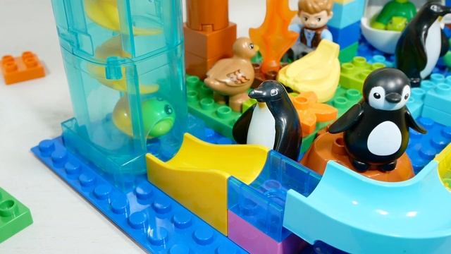 Конструктор - трасса из строительных блоков ☆ забег шариков ASMR - Пингвины и электрический винтовой