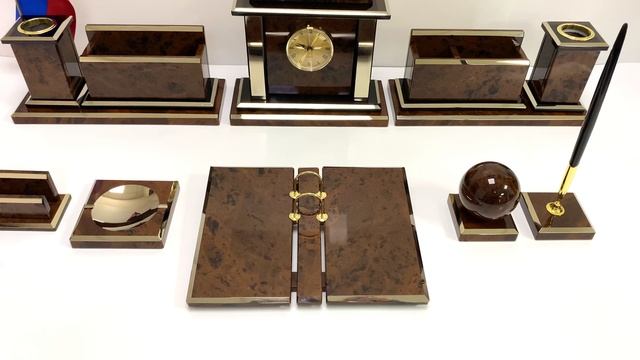 •Материал: обсидиан, кварцевый механизм, латунь. •Техника исполнения: камнерезные работы, нанесение нитрида титана с помощью УВН (установка вакуумного напыление). •Размеры: при плотной компоновке на столе 850*320*205мм. - Часы 225*80*185мм-1шт. - Основание под часы 245*100*20мм-1шт. - Календарница 250*200*30мм-1шт. - Органайзер 190*80*100мм-2шт. - Карандашница 81*81*114мм-2шт. - Основание под органайзер и карандашницу 300*100*20мм-2шт. - Скрепочница 105*105*18мм-1шт. - Подставка с тюльпаном без учета тюльпана 73*73*20мм-1шт. - Подставка под шар 73*73*20мм-1шт, шар Ø69мм-1шт. - Визитница 100*55*50мм-1шт. •Упаковка: картон. •Вес в упаковке: 14,7кг. Цена: 62 720 руб. https://radugakamnya.ru/catalog/suveniry_iz_kamnya/suveniry_iz_obsidiana/pismennye_nabory_iz_obsidiana/nastolnyy_nabor_iz_obsidiana_argo_850_320_205mm_1-613493/