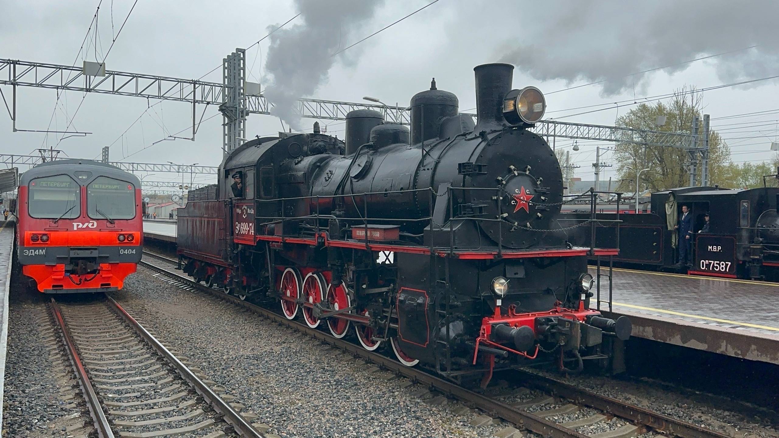 Парад паровозов на Финляндском вокзале к Дню Победы: Оп.7587, Эу699-74, Эр796-46, май 2025 года