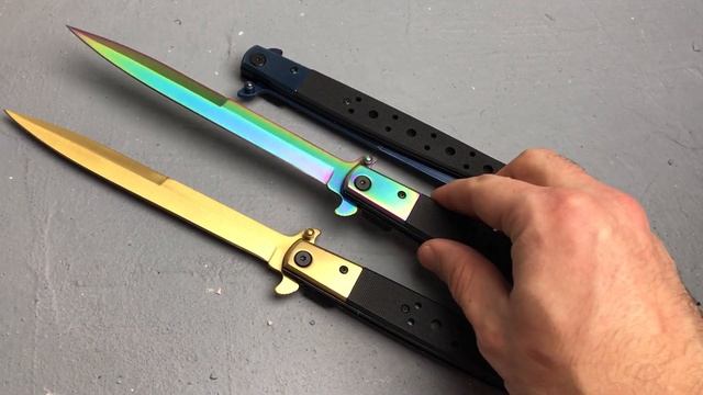 - Exclusive Ti-Treated Extra Large Stiletto Knife - 13" Overall - 5.5" Blade Length, 3CR13 Steel - Spring Assisted Mechanism - Spear Point Blade - G10 Handle Scales w/ Pocket Clip Buy yours: http://www.kolourco.com Instagram: http://www.instagram.com/kolourco Facebook: http://www.facebook.com/kolourco