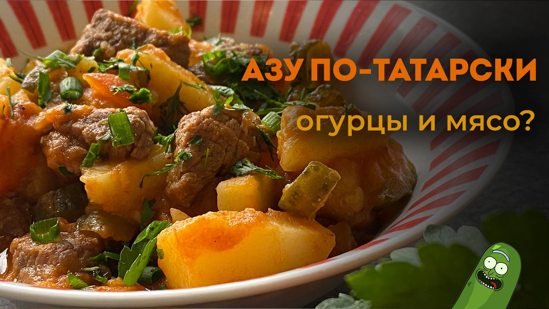 Азу по-татарски. Блюдо, ставшее классическим. Необычное, нежное, но с характером. Граммовки: Говядина - 1,3кг. Соленый огурец - 5шт. (300гр.) Помидор - 2шт. больших (500-700гр). Или консервированные в собственном соку (резанные, протертые, целиковые) Лук - 3шт. средних (500гр.) Морковь - 1шт. средняя (300гр.) Картофель - 1,3кг. Чеснок - 0,5 головки Бульон - 200-400мл. Можно бульонный кубик, можно просто воду. Томатная паста - 2ст. ложки Рассол от огурцов - 1 половник Специи и подача: Лавровый лист - 2-3шт Соль/Сахар/Перец по вкусу Зелень по вкусу для подачи
