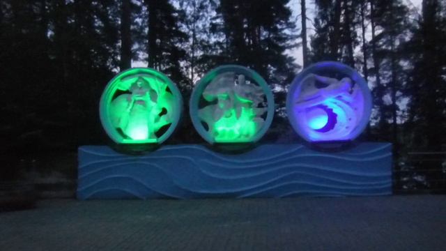 Вечером на территории загородного курорта "Аврора-клуб" статуи подсвечиваются и подсветка меняет цвет. Это можно смотреть бесконечно долго.