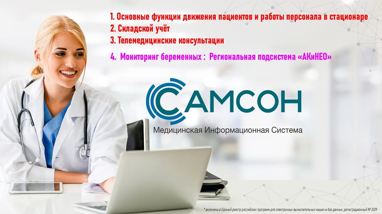 Основные функции для работы в стационаре, складской учет, телемедицинские консультации + Региональная подсистема мониторинга беременных "АКиНЕО" непосредственно в связке с МИС "КПС "САМСОН". Запись "живой" презентации возможностей МИС "КПС "САМСОН" и региональной подсистемы мониторинга беременных "АКиНЕО"", на "живой" базе данных (персональные данные скрыты в целях соблюдения 152-ФЗ). Видео в качестве 4К (!) для рассмотрения деталей интерфейса МИС.