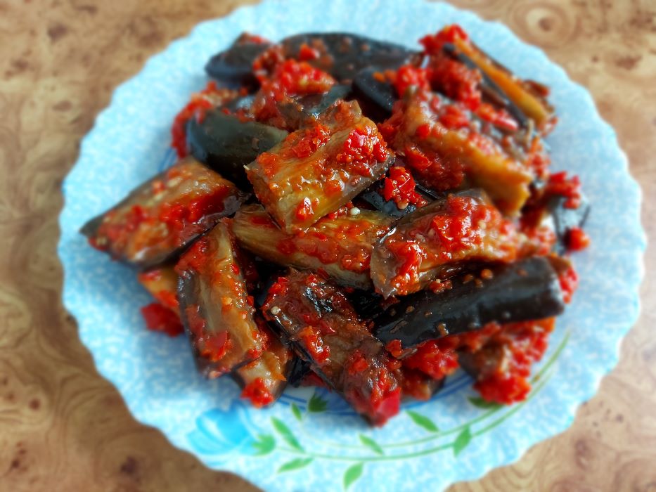 Супер закуска из баклажанов. Готовила впервые эту закуску, мне очень понравилась. Только перец сладкий у меня был с огорода, он видимо переопылился с острым перцем и закуска получилась довольно острой и всё равно вкусной. Обязательно приготовлю ещё. Рецепт: Баклажаны 400 гр. перец сладкий красный 120 гр. (вес очищенного перца) чеснок 3 зубчика соль сахар 1 ст. л. уксус яблочный 6% 1 ст. л. масло растительное 1+ 1 ст. л. (для обжаривания баклажанов и для заправки). Приятного аппетита!