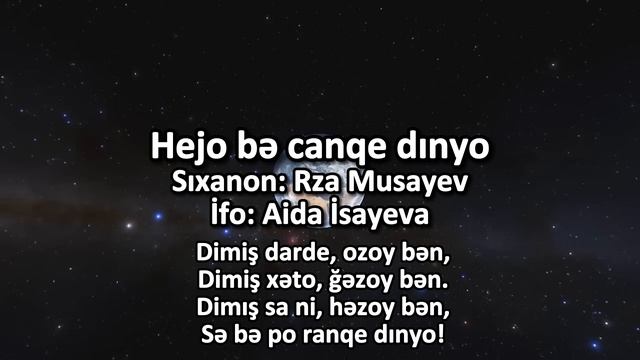 MP3 LİNK: https://cloud.mail.ru/public/WR5L/sfpi4jb5d Hejo bǝ canqe dınyo. Soron soron tojnedən, Soron mıni dojnedǝn. Soron odǝm vijnedən, Hejo bǝ canqe dınyo. Omim rəsim bə penco, Həşto konco, sa konco? Umır qıley xəmənco, Don horǝ dinqe dınyo. Jedə bǝ zardə simi, Nıvışkim bəçey dimi, Dənıvıjim az bimi, Bomıno tanqe dınyo! Milyon sore ro kardə, Hǝy bǝ aspi bo kardə, Ki bə ki həmro kardə, Ros votdən: danqe dınyo. Dimiş darde, ozoy bǝn, Dimiş xǝto, ğǝzoy bǝn. Dimış sa ni, hǝzoy bən, Sə bə po ranqe dınyo! Bey fǝrğ ni; alim, nodon Hǝxe bıvot, ya bıhton, Iştı umri, ha inson, Erızniyə sanqe dınyo. Bǝ umri ni ehtibo, Jimon qıley qonǝ bo. Keybon ojin tobəto, Mıni bǝ vanqe dınyo. Hardǝm ıştə əməli, Umum qırd bıə qədəli. Çəş kardedəm əcəli, Bəmı bǝ zanqe dınyo. Şeir: Rza Musayev İfo: Aida İsayeva Kadusiyon kanali fəaliyəti əniyən ozavziyeş piəkəson ianə karde bəzınen Kadusiyon kanalının fəaliyyətinin dahada inkişafını istəyənlər ianə edə bilərlər 5522 0993 5266 6291 (12/28)