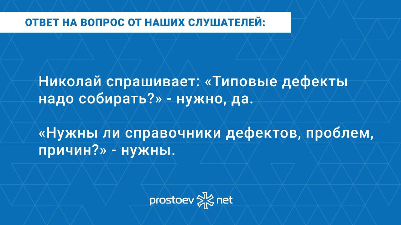 Простоев.НЕТ. #вопрос_ответ_обучение_тоир. Типовые дефекты оборудования надо собирать? Нужны ли справочники дефектов, проблем, причин, последствий? ТОиР. RCM. Техническое обслуживание и ремонт. Мы информационно-образовательный проект по вопросам организации управления процессами поддержания надежности, проведения технического обслуживания и ремонтов технологических систем и оборудования. Подписывайтесь на наш YouTube канал https://www.youtube.com/user/prostoevnet _ Спрашивает Николай Г.: «Типовые дефекты оборудования надо собирать? Нужны ли справочники дефектов, проблем, причин, последствий?» Отвечает Дмитрий Скворцов, директор по развитию ООО «Простоев.НЕТ»: 0:00 prostoev.net 0:31 Николай спрашивает: «Типовые дефекты надо собирать?» - нужно, да. 0:34 «Нужны ли справочники дефектов, проблем, причин?» - нужны. 0:40 Если вы не делаете именно типовые справочники дефектов, люди будут писать все, что они захотят. Соответственно задача тех же самых причин дефектов превращается в кошмар: перебрать эти записи руками – это, можно сказать, невыполнимая задача. 1:00 Если есть справочник видов оборудования, к этим видам привязаны виды дефектов, и пользователи дефект привязки к оборудованию, то задача инженера по надежности – выбрать эти записи и сделать анализ. _ Мы в соцсетях: Facebook https://www.facebook.com/www.prostoev... VK https://vk.com/prostoev__net Linkedin https://www.linkedin.com/groups/8464641 Одноклассники https://ok.ru/group/58505577300000 Инстаграм https://www.instagram.com/prostoevnet/ _ http://www.prostoev.net - Информационно-образовательный портал Управления ТОиР #вопрос_ответ_обучение_тоир, #prostoevnet, #простоевнет, #надежность, #дефекты #справочники_дефектов, #оптимизация_оборудования, #тоир, #техническое_обслуживание #техническое_обслуживание_и_ремонт, #RCM, #управление_надежностью, #надежность_оборудования, #оборудование, #обучение_управление_ремонтами, #обучение_технических_специалистов, #планирование_управление_ремонтными_работами, #ремонтные_работы, #управление_обслуживанием_ремонтами, #безотказная_эксплуатация_оборудования, #планирование_работ, #база_данных_оборудования, #состояние_оборудования, #ремонты