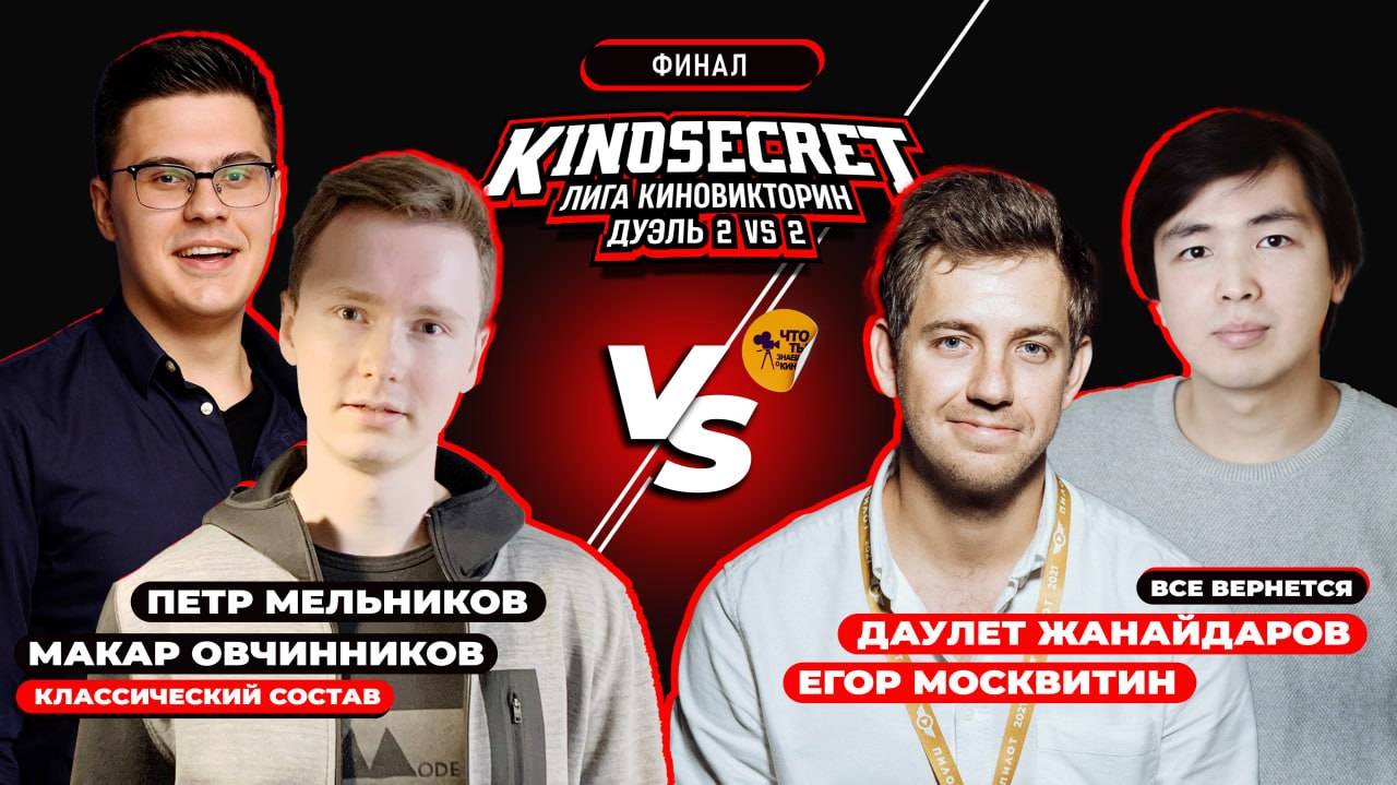Лига КиноВикторин - большой проект, который объединяет киноманов со всего мира. Одним из форматов Лиги является игра КиноСекрет.Дуэль. КиноСекрет.Дуэль 2 vs 2 - это игра в которой участники игра в командах выясняют кто из них лучше всего разбирается в кинематографе. Участники финальной игры спец.сезона среди блогеров: 1. Команда "Классический состав" - киноблогеры и соавторы каналов Кино Огонь, Пожарная команда и Кино Огонь. Подкасты: Петр Мельников и Макар Овчинников 2. Команда "Все вернется" - кинокритики Егор Москвитин и Даулет Жанайдаров За кого болеете вы? ------------- Если вы хотите поддержать наш проект, это можно сделать по ссылке: https://boosty.to/kinosecret/donate Если вы хотите, чтобы ваши вопросы прозвучали в одном из ближайших выпусков, отправляйте свои наброски на почту - info@kinosecret.com Если вы хотите принять участие в записи Своей Игры среди подписчиков канала, выполните действия, которые описаны в этом видео - https://youtu.be/AYPrJH0AJ_I -------------- Таймлайн: 00:00 - Вводная информация об игре 03:35 - Приветствие игроков 11:07 - Первый раунд 26:12 - Второй раунд 44:53 - Третий раунд 54:37 - Четвертый раунд 1:08:49 - Пятый раунд -------------- Наш телеграм канал - https://t.me/QuizKinoSecret Наш сайт - http://www.kinosecret.com/ Наши игры в Иркутске - https://vk.com/kinosecret Наши подкасты - https://kinosecret.mave.digital/ Наш инстаграм - https://www.instagram.com/kinosecret_quiz/ Наша группа в ВК - https://vk.com/kinosecret_russia По условиям франшизы - http://www.kinosecret.com/franshisa/ -------------- #киносекрет #KinoSecret #свояигра #квиз #quiz #квизонлайн #квизкино #киноквиз #квизкиноимузыка #викторина #киновикторина #онлайнкиноквиз