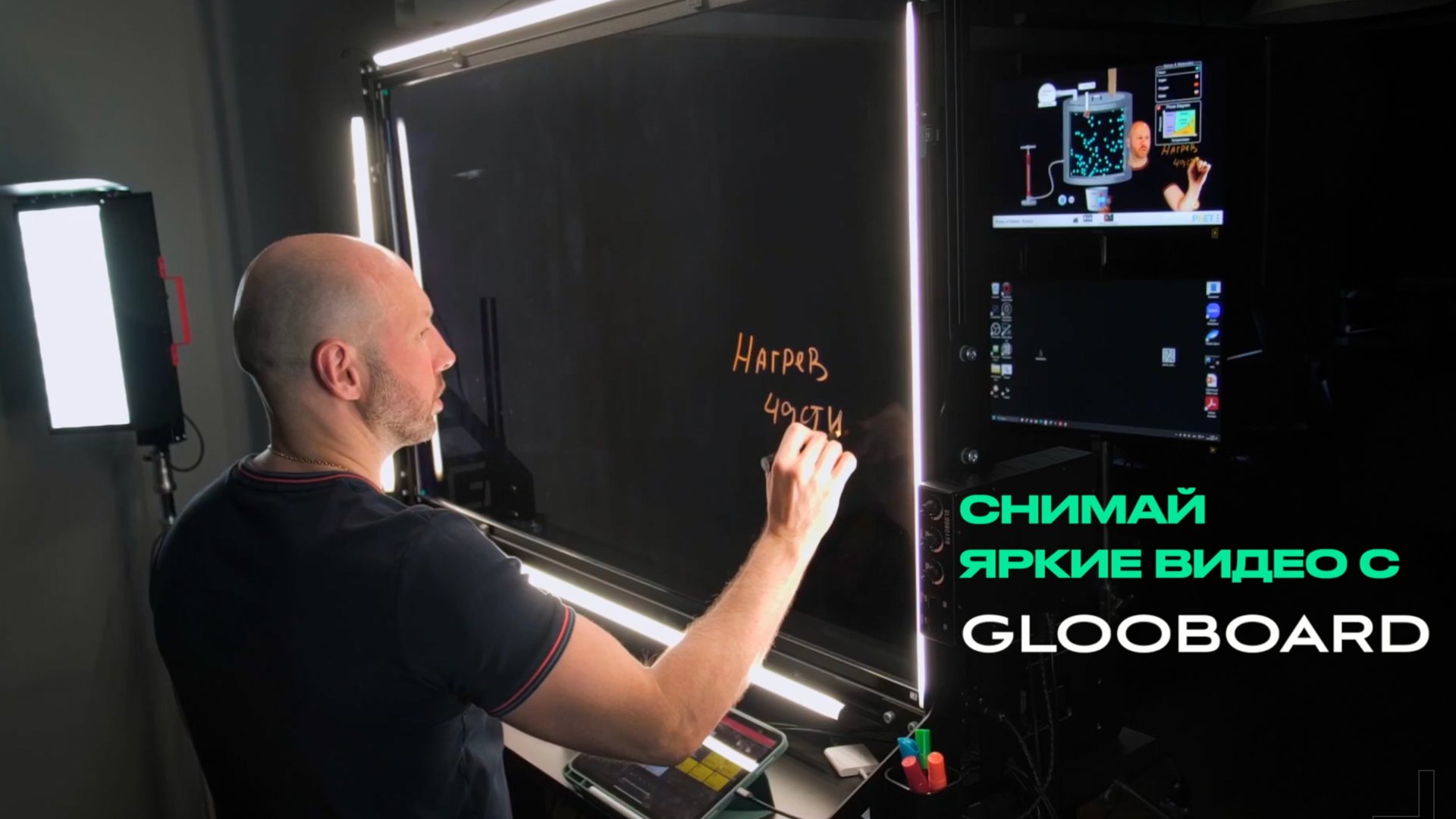 Видеостудия GlooBoard - это программно -аппаратный комплекс для создания видео и трансляций в сеть интернет. Готовое настроенное решение на базе прозрачной доски для создания видеоконтента без привлечения команды профессионалов в процесс съемки. По согласованию, возможна опция: сенсорная рамка стекла. Получить консультацию WhatsApp +7(495)984-35-32 Telegram @RdlLed Заказать видеостудию с доставкой и подключением за 14 дней Производим оборудование на нашем предприятии в Московской области. К заказу доступно два размера студии, GlooBoard 66' и GlooBoard 82' устанавливаемых в зависимости от размера помещения Хештеги: Lightboard, Джалинга, Видеодоска, jalinga, AZBOOKA, idesk, прозрачная маркерная доска, приказ 838