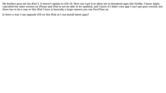 Apple: iPad 2 can't update past iOS 9.3.5 Helpful? Please support me on Patreon: https://www.patreon.com/roelvandepaar With thanks & praise to God, and with thanks to the many people who have made this project possible! | Content (except music & images) licensed under CC BY-SA https://meta.stackexchange.com/help/licensing | Music: https://www.bensound.com/licensing | Images: https://stocksnap.io/license & others | With thanks to user Rafael Torres (apple.stackexchange.com/users/296258), user Nimesh Neema (apple.stackexchange.com/users/279727), user IconDaemon (apple.stackexchange.com/users/22824), and the Stack Exchange Network (apple.stackexchange.com/questions/331571). Trademarks are property of their respective owners. Disclaimer: All information is provided "AS IS" without warranty of any kind. You are responsible for your own actions. Please contact me if anything is amiss at Roel D.OT VandePaar A.T gmail.com