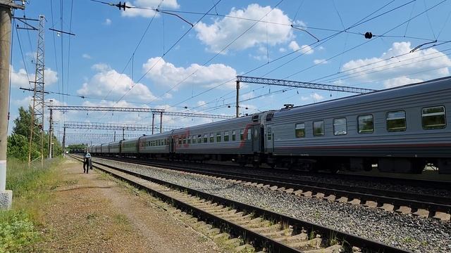 3 июня 2023 года в 14:49 станция Торбеево Куйбышевская железная дорога arrival at Torbeevo station, EP2K-370 with train No. 105 Orenburg - St. Petersburg and the star of the screen June 3, 2023 at 2:49 pm Torbeevo station Kuibyshevskaya railway