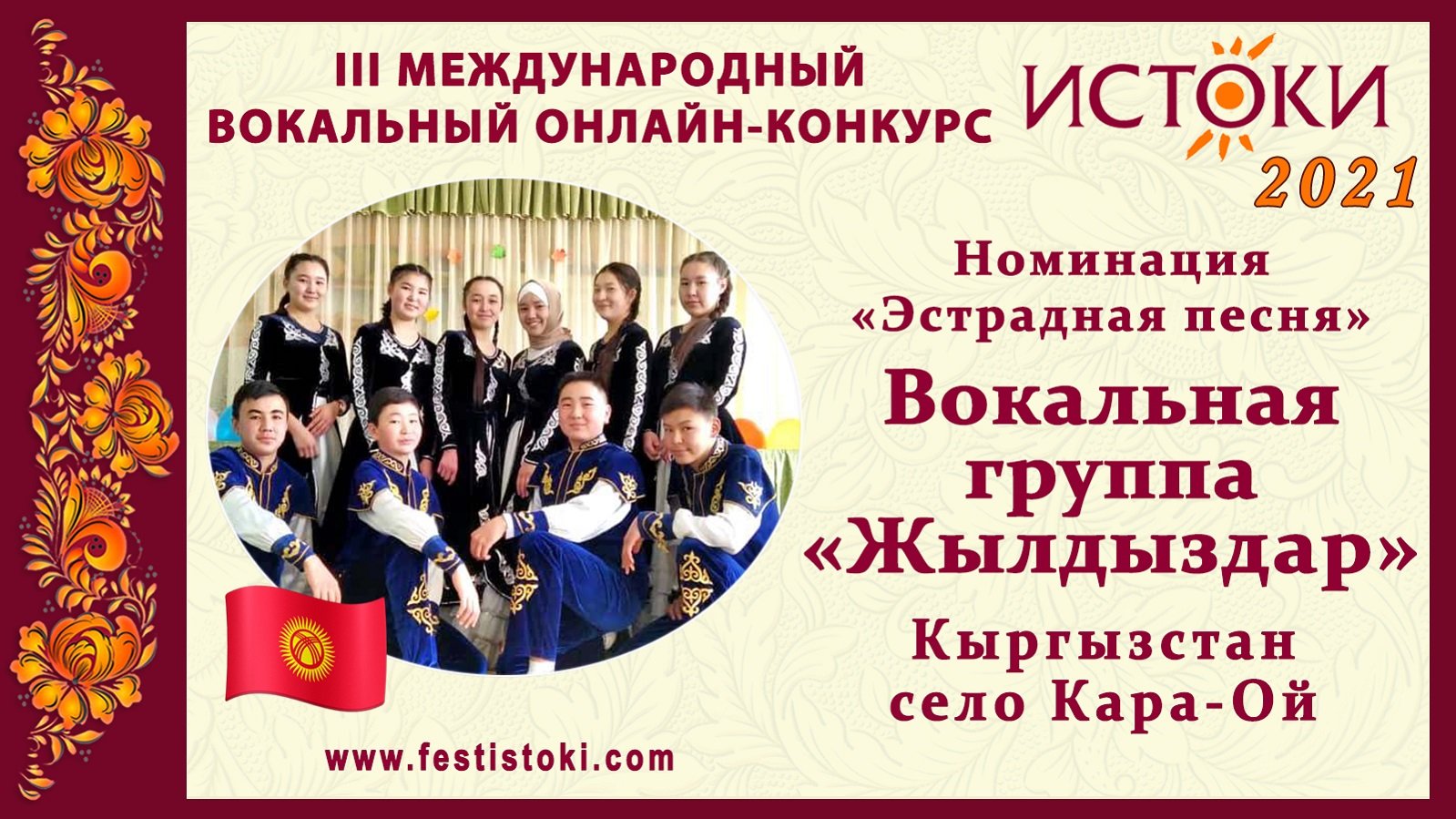 Лауреат III степени III Международного вокального онлайн-конкурса «Истоки». Номинация "Эстрадная песня". Песня "Кыргыз элин данктайлы". Музыка Джоошева, слова Качкынбаева. Сайт: www.festistoki.ru / www.festistoki.com E-mail: festistoki@mail.ru