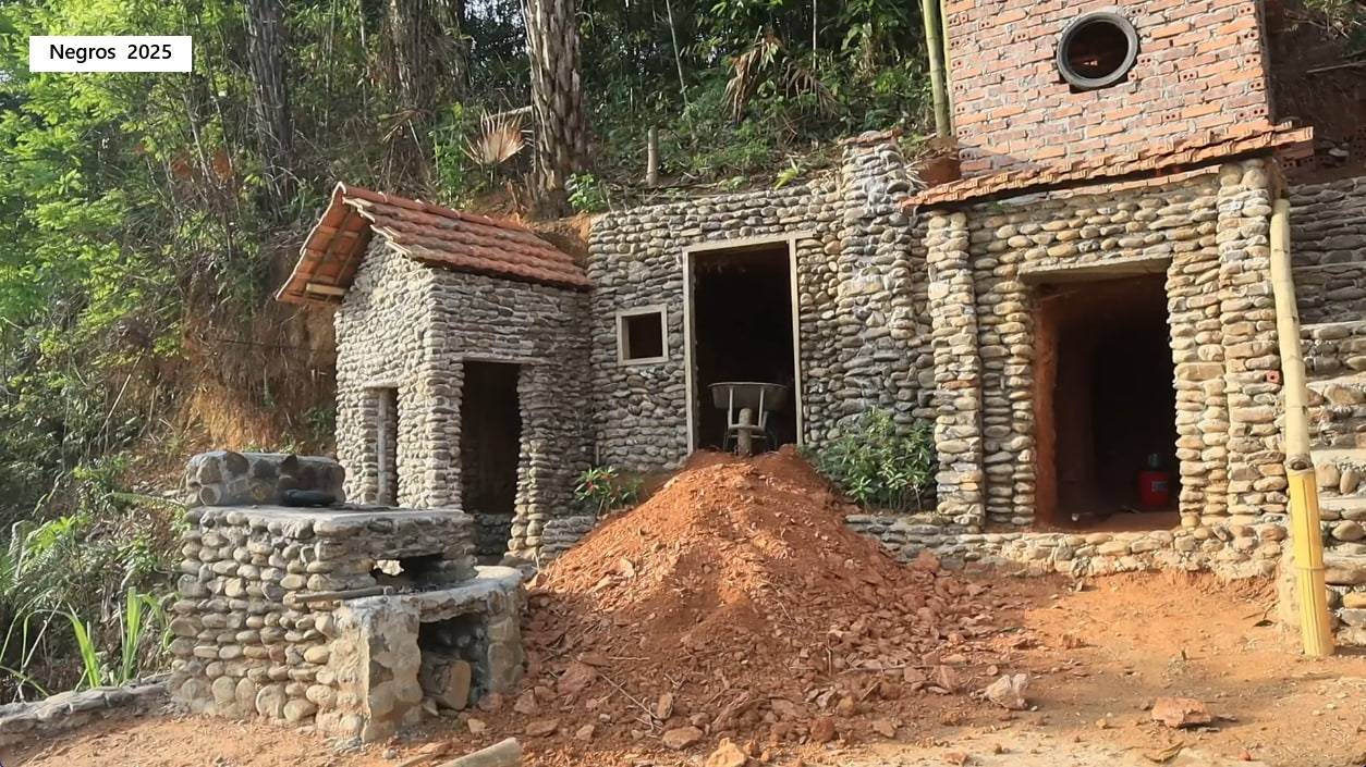 София 31. София выкладывает каменные стены и потолок из бамбука в комнатах в скале.