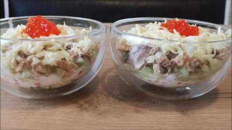 Слоеный салат с икрой и горбушей Порционный салат