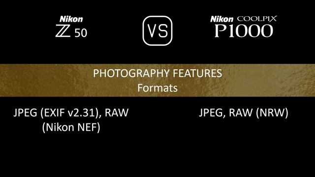 This video overviews the Nikon Z50 and the Nikon COOLPIX P1000 in a parallel comparison of specifications. Thanks for watching. If you liked this video and found it informative, make sure to subscribe for more. 00:24 LAUNCH 00:32 BODY 00:40 SENSOR 01:05 IMAGE 01:21 OPTICS & FOCUS 02:10 SCREEN 02:30 VIEWFINDER 02:46 PHOTOGRAPHY FEATURES 03:47 VIDEOGRAPHY FEATURES 04:03 STORAGE 04:08 CONNECTIVITY 04:32 PHYSICAL 04:52 MISC