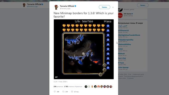 ИТАК, товарищи, я вернулся, и не с пустыми руками с: ЧТО ЖЕ вы думаете про такое нововведение с картой?? Видосы теперь будут выходить и по Майну и по Терке Группа вк - https://vk.com/s.j_clan Пост твитера - https://twitter.com/Terraria_Logic/status/950810636040200198
