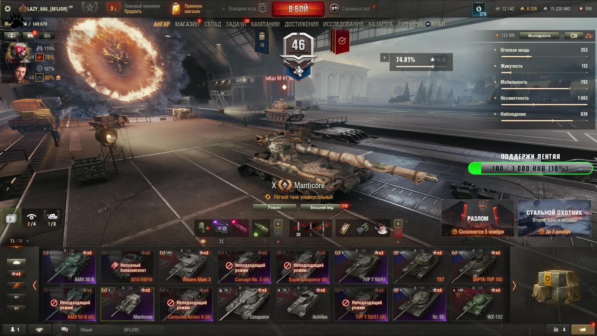 Мир танков Manticore 74% путь ко 2 отметке