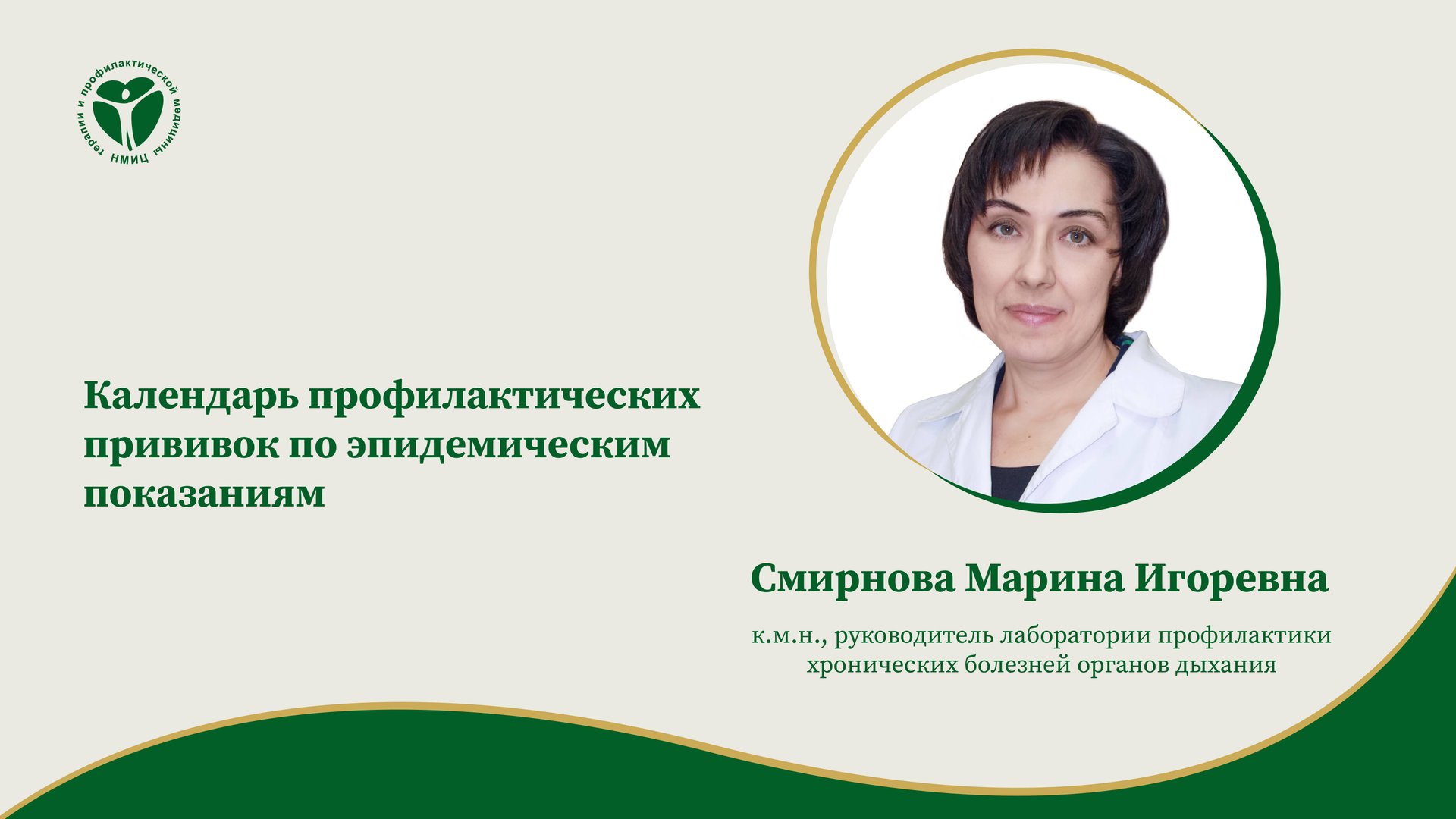 «Календарь профилактических прививок по эпидемическим показаниям», лекция от 13.11.2024. Лектор: Смирнова Марина Игоревна, к.м.н., руководитель лаборатории профилактики хронических болезней органов дыхания ФГБУ «НМИЦ ТПМ» Минздрава России.