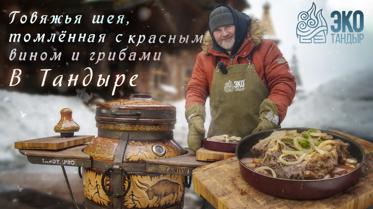 Говяжья шея томлёная с красным вином и грибами в тандыре. Рецепт Олега Ольхова для ЭкоТандыра
