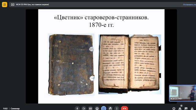 Докладчик: Николай Алексеевич Старухин (к.и.н., научный сотрудник сектора археографии и источниковедения Института истории СО РАН) Тема доклада: Полевые археографические исследования Института истории СО РАН во второй половине XX - начале XXI вв. (из истории организации и опыта работы). Аннотация: С середины 1960-х годов на территории Сибири, Урала, Средней Азии были обнаружены ценные источники (всего на государственное хранение поставлено свыше 1,5 тысяч старопечатных и других малоизвестных изданий). Среди них — рукописный сборник XVI в. (Сибирский список), который содержит, в частности, наиболее полный комплекс источников по следственному делу Максима Грека; догматико-политические сочинения крестьян-старообрядцев XVIII—XIX вв. (значительная часть опубликована в издании «Духовная литература староверов Востока России XVIII–XX вв. и других.