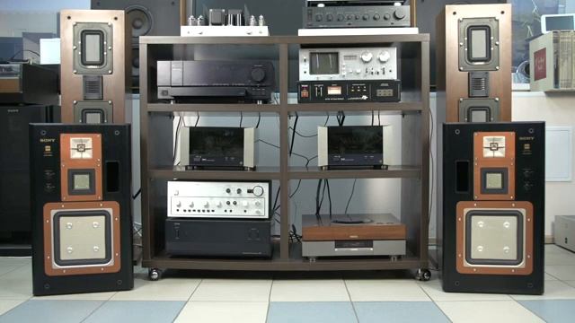 SONY APM-66ES ¥59,800(1台、1986年発売) Воспроизведение от 28 Герц до 45000 Герц!!! アモルファスダイヤモンド採用トゥイーターや多点駆動ウーファー、アコースティカリー・ラウンデッド・エンクロージャーなど、ひとつひとつの完成度を高めたAPM3ウェイスピーカーシステム。 低域には424cm2APM型ウーファーを採用しています。 アルミハニカム振動版をボイスコイルに直結した複数のアーマチュアで駆動し、分割振動を効果的にキャンセルする多点駆動の思想を発展させ、合計8本のアーマチュアで高次モードまでの分割振動をキャンセルしてます。 これにより、同等のコーン型ウーファーの約5倍ものピストニックモーション帯域を獲得し、4kHzまでフラットな広い再生帯域を実現しています。 この駆動方式のメリットを生かすため、磁束の対称性に優れたT型ポールピース、振動版の背圧を減少させる穴開きヨークなどによる低歪設計の磁気回路を搭載しています。 さらに、高耐熱・高剛性のアミド系ボビン採用の高効率な無酸素銅エッジワイズ・ボイスコイル、ダイキャストフレームなどの採用により、デジタルソースのより忠実な再生を図っています。 中域には両面駆動方式の48cm2APM型ミッドレンジを採用しています。 振動版には、アルミをベースとした3層構造強化アルミスキン材を採用しています。これは、内部に細かな空洞をもつ強化アルミ材の表面に制振処理を施したもので、合成を高めると同時に内部損失を大きくとれています。この振動版前後のズキン材のスイートスポットを両面駆動しており、音の立ち上がりや伸びやかさを向上させています。 また、磁気回路にはT型ポールピース、穴開きヨーク、銅キャップなどで低歪設計を徹底するとともに、クラス最大級のストロンチウムフェライトマグネット、無酸素銅被覆アルミエッジワイズ、ボイスコイルを採用しています。 さらに、バックチェンバーを採用して最低共振周波数を低く設計しています。 高域には振動版にアモルファス・ダイヤモンドを使用した9cm2APM型トゥイーターを採用しています。 アモルファス・ダイヤモンドはダイヤモンドにきわめて近い物理特性を持つ炭素材で、音速は18,300m/secに達しています。この新素材をアルミスキン材に蒸着する事に成功しており、高い音速値と合成の高さ、アルミハニカム構造の相乗効果で、すぐれたトランジェント特性を得ています。 さらに、ボイスコイルには軽量かつ高効率の銅被覆アルミエッジワイズ線を採用し、また磁気回路にはクラス最大級のストロンチウムフェライトマグネットを搭載するとともに、放熱効果やダンピング効果の高い磁性流体をボイスコイル・キャップに注入しています。 ネットワーク部は、低歪、低損失で聴感的にも吟味された厳選パーツを採用しています。 大電流が流れるウーファー用コイルには、線径1.5mmの太い線材を使用し抵抗分による音質劣化を防いだほか、各コイルは各々に適した空芯構造、珪素鋼板コアを採用し、歪や音の濁りを抑えています。 さらに、ウーファー用とトゥイーター用、ミッドレンジ用の2個のコイルをそれぞれ互いに直交する形で2枚の基板にまとめ、基板同士も最も干渉の少ない位置に分散配置してます。 また、防振性の高いプラスチックケース入り大型電解コンデンサーとポリエステルフィルムコンデンサーを使い分けクセの無い透明感のある再生音を得ています。 コイルの線材、コンデンサーのリード線など内部配線材には無酸素銅を採用しています。 スピーカーから放射された音波がエンクロージャ−の角で反射する音の回折現象を回避するため、4つのコーナーにRをもたせたA.R.E.(アコースティカリー・ラウンデッド・エンクロージャー)を採用しています。 さらにAPM-66ESでは前面上部にもスラントをつけ、高域の回折現象を低減しています。 また、エンクロージャーの素材は北米産の針葉樹チップによる高密度パーチクルボードを採用しており、十分な板厚と補強に加え、裏板内側に細溝を入れるなど箱鳴りや音のクセを極力抑え、自然な響きにチューニングしています。 仕上げは木目調ブラック仕上げとなっています。 レベルコントロールを搭載しており、ミッドレンジ、トゥイーターそれぞれ0dB~50dBの範囲で調整可能です。 別売りで専用のスピーカースタンドが用意されています。 このスタンドはエンクロージャー底部にボルトでしっかり固定でき、高さもリスナーが腰掛けた状態で最適になるように配慮されてます。 また、スタンド底板の上面に吸音シートを貼り、音の反射を防いでいます。 方式 3ウェイ・3スピーカー・バスレフ方式・ブックシェルフ型 ユニット 低域用:424cm2平面型 中域用:48cm2平面型 高域用:9cm2平面型 再生周波数帯域 28Hz~45000Hz 出力音圧レベル 90dB/W/m インピーダンス 6Ω 瞬間最大入力レベル 200W 定格入力レベル 100W クロスオーバー周波数 600Hz、4.5kHz 外形寸法 幅380x高さ660x奥行365mm 重量 27kg 付属 スピーカーコード 