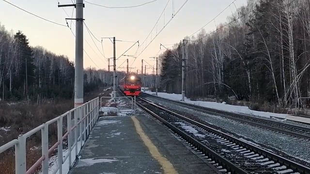 Электропоезд ЭД4М-0150 с пригородным поездом №6056 Златоуст - Челябинск прибывает на О.п. Каширинский, г. Чебаркуль, Челябинская обл., ЮУЖД Дата: 28.11.2021