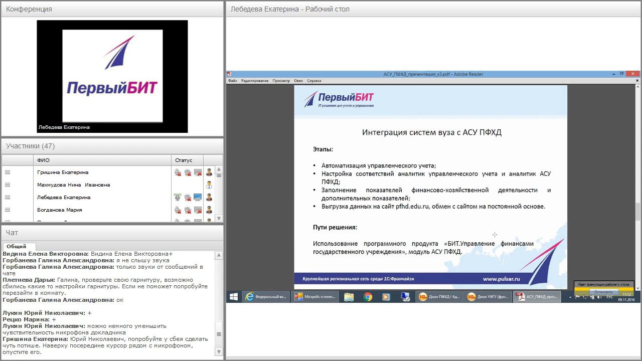 • Автоматизированная система управления планами финансово-хозяйственной деятельности (АСУ ПФХД): - Назначение АСУ ПФХД; - Структура АСУ ПФХД; - Интеграция АСУ ПФХД с системами вузов; • Интеграция систем вуза с АСУ ПФХД Пути решения: функциональные возможности продукта «БИТ. Управление финансами государственного учреждения» в части интеграции с АСУ ПФХД; • Обзор основных проблем государственных учреждений, связанных с управлением финансами и их решение с помощью автоматизации: обзор информационной системы «БИТ.Управление финансами государственного учреждения»; • Практические рекомендации по настройке интеграции с сервисом На примере решения «БИТ.Управление финансами государственного учреждения»; • Опыт в интеграции с АСУ ПФХД в реальных примерах; • Ответы на вопросы.