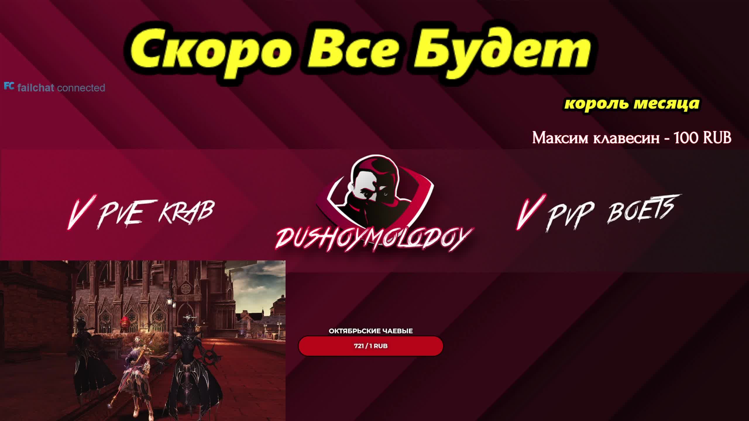 💪💪💪Ссылка на сервер с бонусами для новичков и вернувшихся игроков - https://ru.4game.com/s2s/dushoymolodoy_eva (версия Project Eva) https://4ga.me/essence_DushoyMolodoy (версия Essence) https://ru.4game.com/s2s/lineage2_dushoymolodoy (версия Main) https://ru.4game.com/s2s/legacy_dushoymolodoy (версия Legacy). От души благодарю! Получай подарки за предрегистрацию в новой ММО Grand Saga - https://4ga.me/3TdxaO0 Реклама. ООО «Иннова Дистрибьюшен», ОГРН 1077763692720 Erid: 2VtzqwJXVhv Erid: 2VtzqxcGsyT 📢📢📢 Ссылки на все мои социальные сети, где проходят анонсы роликов/стримов: https://t.me/dushoymolodoystream https://discord.gg/RDGqZya https://vk.com/dushoymolodoy Твич канал https://www.twitch.tv/dushoymolodoy Команды в чате: !ref, !tg На всякий случай: 📢📢📢Видеоролики уже дублируются сюда: https://zen.yandex.ru/id/622b53a99fefa169212eff8e 📢📢📢 Стримы будут тут: https://trovo.live/dushoymolodoy Не забывай оценивать видео лайком/дизлайком, это очень помогает в продвижении, а также подписываться на канал. 🌟🌟🌟Поддержать рублем https://www.donationalerts.com/r/dushoymolodoy Огромное спасибо за поддержку. Дай Бог Вам здоровья! 1. peaceducks_ - 21 011 rub 2. ErementarLightning - 15000 rub 3. Амири - 15000 rub 4. Юрий Иванов - 11850 rub 5. vitechek_tu_ru_ru - 10570 rub 6. Gandik - 6576 rub 7. Poggrimmon - 5230 rub 8. CyberHelper - 5000 rub 9. SecretCode - 3665 rub 10. Tangens (Дмитрий) - 3600 rub И всем остальным огромное спасибо за поддержку! Обновлено 04.09.22 #lineage2 #l2main #Lineage2Essence