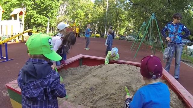 Маленький Тема (2 года) с двоюродным братишкой Саввой (2 года) играют в песочнице.