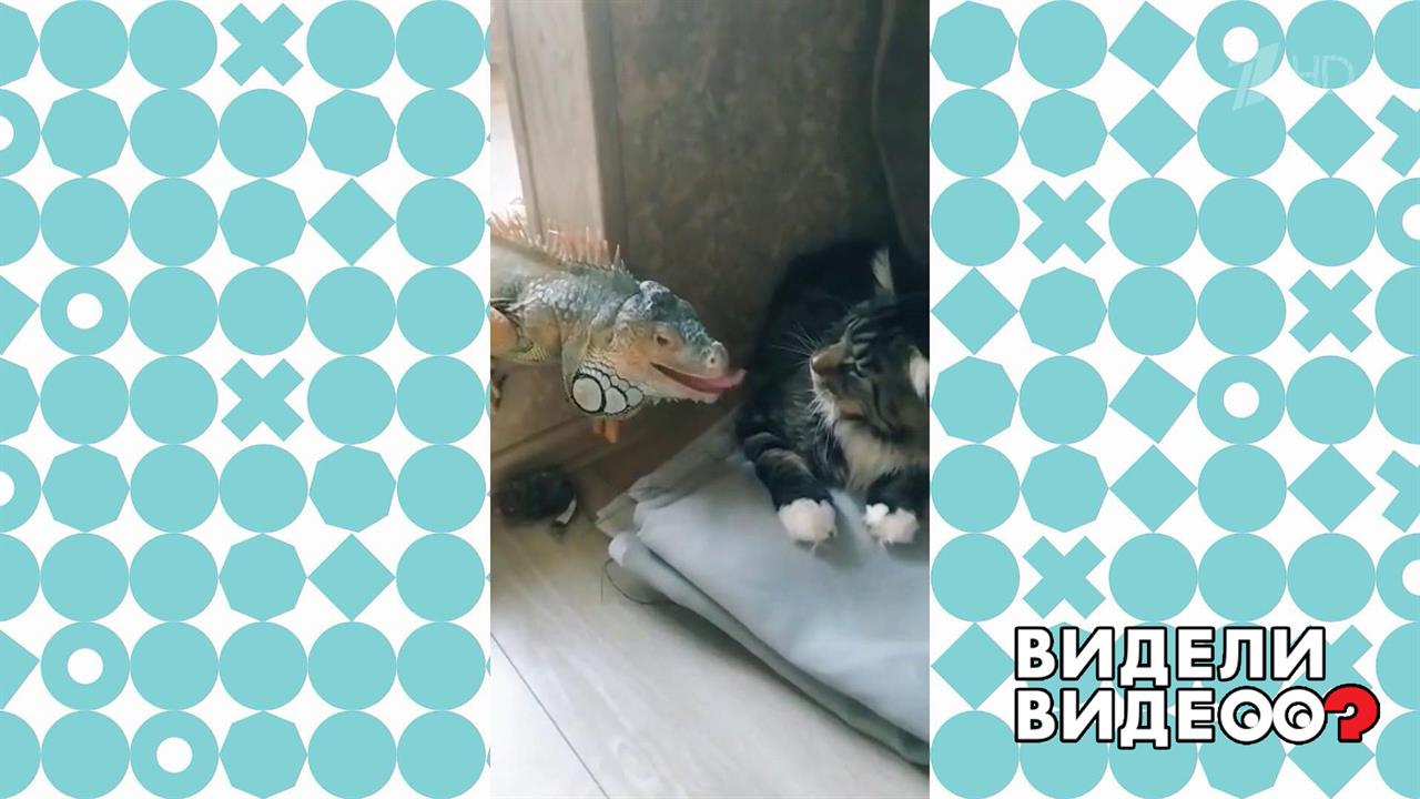 Игуана Лали очень хочет пообщаться с котом Батоном. Но кот против!