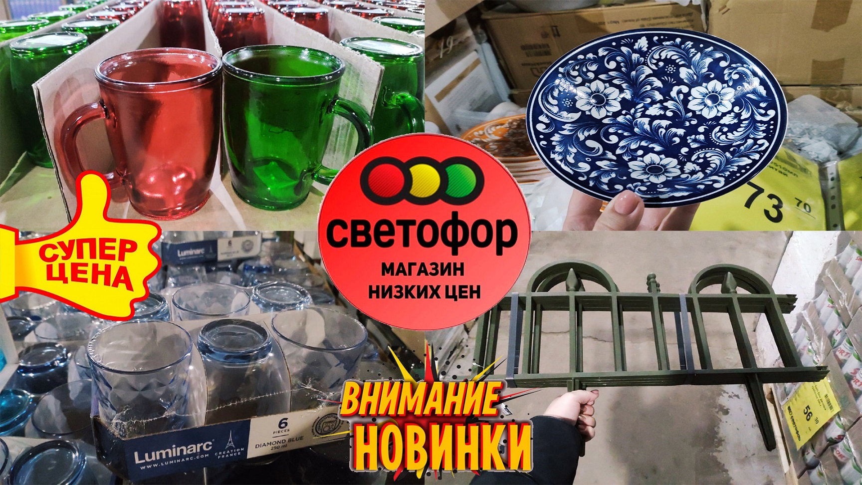 В Светофор привезли новый товар. Шикарные наборы бокалов,декоративные заборы,яркие тарелки,летние футболки. Обзор магазина.