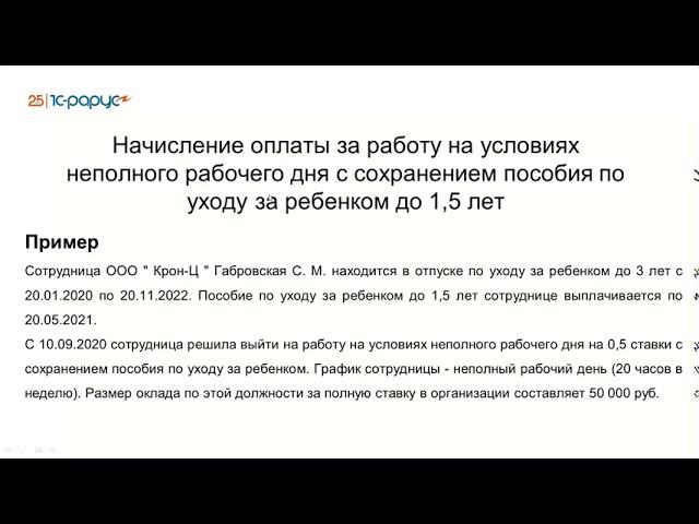 Запись вебинара от 14 сентября 2020 года на тему "Частые ошибки кадрового учета и расчета заработной платы в ЗУП 3.1" Программа вебинара: Регистрация документов сотрудников с неполным рабочим днем и перевод на дистанционную работу: Графики работы для неполного рабочего времени: Начисление оплаты за работу на условиях неполного рабочего дня с сохранением пособия по уходу за ребенком до 1,5 лет в программе «1С:Зарплата и управление персоналом 8» 1С:ЗУП 8. Как при отзыве из отпуска на несколько часов компенсировать это время? Прием на работу по срочному трудовому договору в программе 1С:ЗУП 8. Оформление переводов сотрудников на дистанционную (удаленную) работу в связи с карантином в программе. Пилотный проект ФСС — работа с больничными листами в 1С:ЗУП (20 мин): Настройка «Учетной политики» в 1С:ЗУП8. Настройка рабочее место «Пособия за счет ФСС» в 1С:ЗУП 8. Передача в ФСС сведений о пособиях в 1С:ЗУП 8.