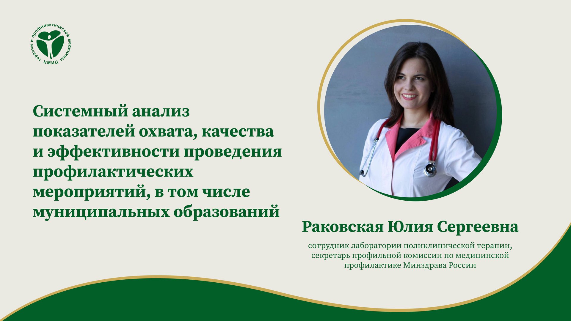 «Системный анализ показателей охвата, качества и эффективности проведения профилактических мероприятий», лекция от 09.07.2024. Лектор: Раковская Юлия Сергеевна, младший научный сотрудник лаборатории поликлинической терапии ФГБУ «НМИЦ ТПМ» Минздрава России, секретарь профильной комиссии по медицинской профилактике Минздрава России.