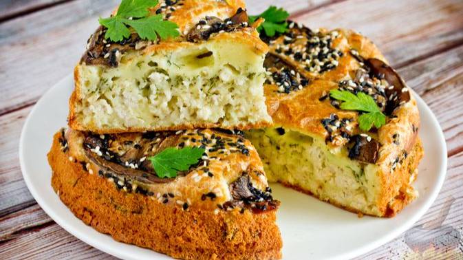 Славится вкусом, скоростью и лёгкостью приготовления. ЗАЛИВНОЙ ПИРОГ С КУРОЙ И ГРИБАМИ