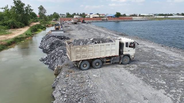 Nice Action This Day!! Shantui Bulldozer Pushing Stone Loading By Dump Trucks