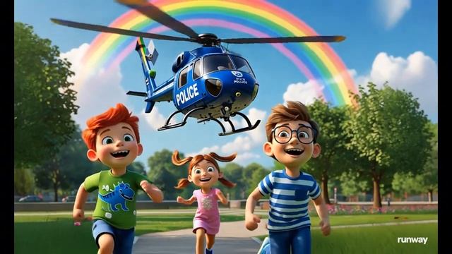 Присоединяйтесь к весёлому приключению с полицейским вертолётом и его друзьями! В этом ярком и добром клипе вы увидите, как вертолёт помогает детям найти потерянные игрушки, рисует радугу в небе и освещает путь звёздной ночью. Смотрите, как рыжий мальчик, девочка с хвостиками и мальчик в очках весело проводят время с их новым другом – полицейским вертолётом!