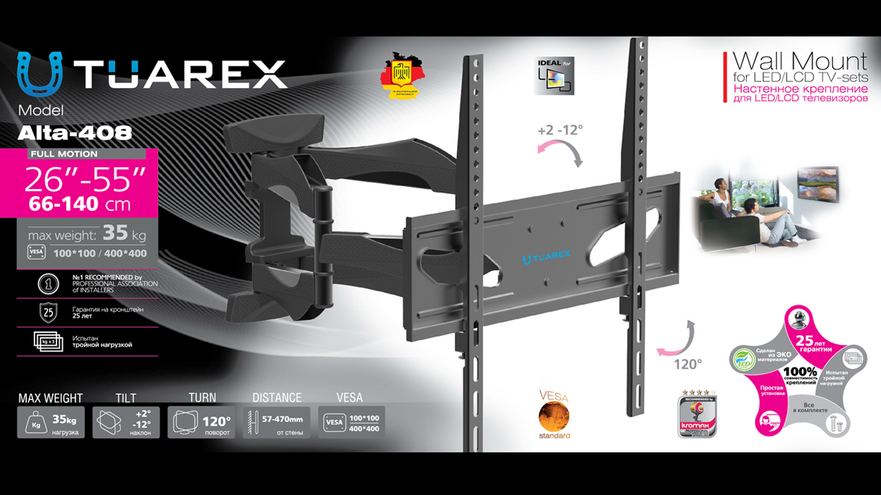 TUAREX ALTA-408 BLACK надёжно удержит экран размером 26"-55" дюйма и весом 35 кг. Простая конструкция TUAREX ALTA-408 BLACK идеально подойдет для самостоятельного монтажа. Наклонно-поворотная регулировка позволит наклонять вверх и вниз на +2 -12°, поворачивать влево и вправо на 120°, и выдвигать на 57-470 мм. Кронштейн подходит для большинства телевизоров популярных брендов, таких как Samsung, LG, Sony, Panasonic, Sharp, Toshiba, KIVI, Xiaomi Mi, SUPRA, Hyundai, Erisson, Horizont, JVC, Thomson, HAIER, BBK, Витязь, Веко, BQ, OZON, SkyLine, Pioneer, Philips, Rolsen, Harper, Hisense, Hitachi, Polarline, Prestigio и других. Крепёжные отверстия TUAREX ALTA-408 BLACK изготовлены по стандарту VESA. В комплектацию TUAREX ALTA-408 BLACK входят необходимые для монтажа материалы. Вся продукция обеспечивается гарантийными обязательствами. 25 лет гарантии на все сварные и механические соединения позволит наслаждаться конструкцией долгий срок. Во время эксплуатации TUAREX ALTA-408 BLACK демонстрирует поразительную износостойкость и безотказность. Подробнее https://www.kromax.ru/produce/pan_tilt/8484/