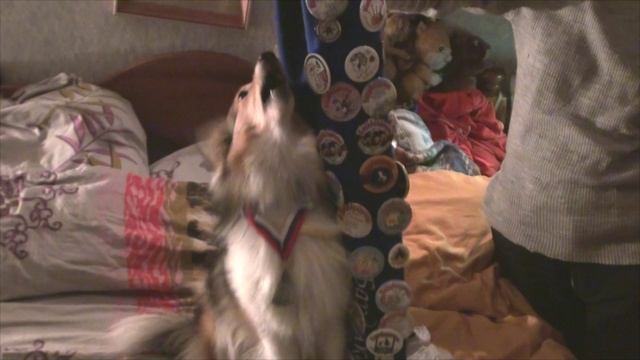 Собака Лета играет со значками с БардАкадемии осень 2020 Таня Долгова Белка