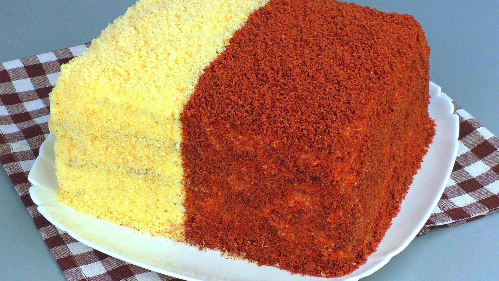 Продукты: Белый корж: 200 гр. сахара 1 стакан сметаны 15-20% (стакан на 200 мл.) 2 яйца (крупных) 150 грамм муки щепотка соли 1,5 ч. ложки разрыхлителя Тёмный корж: 200 гр. сахара 1 стакан сметаны 15-20% (стакан на 200 мл.) 2 яйца (крупных) 130 грамм муки щепотка соли 1,5 ч. ложки разрыхлителя 3 ст. ложки какао Выпекать один корж 12-14 минут при температуре 180 гр. Используйте хороший пергамент с антипригарным покрытием. Размер противня 32*40 см. Крем: 150 гр. сливочного масла (комнатной температуры) 250 гр. сгущёнки (комнатной температуры) 250 гр. сметаны 25-30% (можно холодную) Крем можно использовать любой.