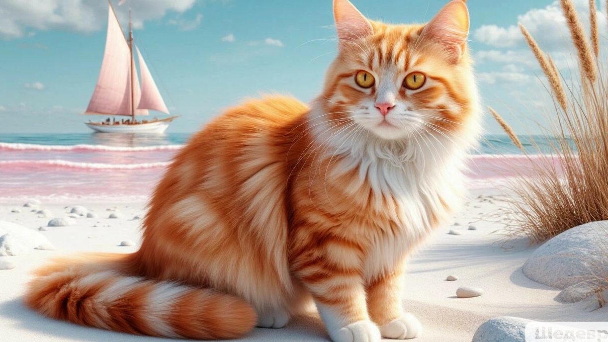 Классное видео о рыжем коте-274 выпуск: красивая кошка в красивом месте-на розовом море.
