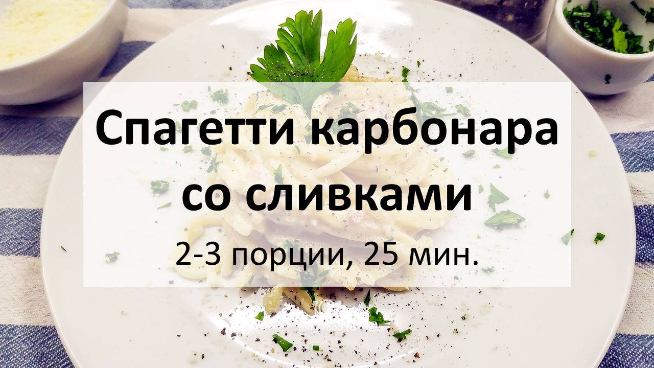 Всем привет. «Спагетти карбонара со сливками» звучит так же странно как «пицца с ананасами». То есть как что-то неклассическое, вызывающее истошный вопль у поборников кулинарной чистоты, но имеющее прекрасные шансы на жизнь, поскольку вкус-то, чёрт возьми, неплох! Действительно, жизнь не стоит на месте и если бы всё было строго по правилам, традиционно и по старинке, мы бы до сих пор на телегах ездили, да пустую похлёбку лаптем хлебали. В общем, ломаем традиции, готовим «продвинутый» рецепт карбонары и это, действительно, будет вкусно. • Спагетти, 200 гр. • Сливки 20%, 200 мл • Яйца, 2 шт. • Бекон с/к, 100 гр. • Лук, 1 шт. • Пармезан, 30 гр. • Чеснок, 1 зубец • Петрушка • Чёрный перец, растительное масло, соль Спагетти отвариваем в кипящей подсоленной воде 7 минут, снимаем с огня, вливаем полстакана холодной воды, отвар не сливаем. Сыр натираем на мелкой тёрке, лук режем кубиком, бекон ломтиками, чеснок и петрушку рубим мелко, желтки отделяем от белков. Обжариваем бекон на сильном огне с 1 ч. л. растительного масла пару минут, добавляем лук, чеснок, убавляем огонь до среднего, готовим пять минут, помешивая. Вливаем сливки, готовим пару минут, добавляем спагетти, 100 мл воды из-под них, доводим до кипения, готовим на среднем огне до желаемой степени готовности пасты. (если любите al dente, то буквально минуту, если хотите поразваристее, то минут пять). В миске смешиваем 2/3 пармезана, яичные желтки, приправляем солью и молотым перцем, добавляем в сковороду, тщательно размешиваем, прогреваем минуту. Если получилось очень густо, добавляем немного воды из-под пасты, перемешиваем. Подаём с оставшимся пармезаном, петрушкой, и молотым перцем. Приятного аппетита! Текстовая версия на сайте: https://blog-food.ru/1274