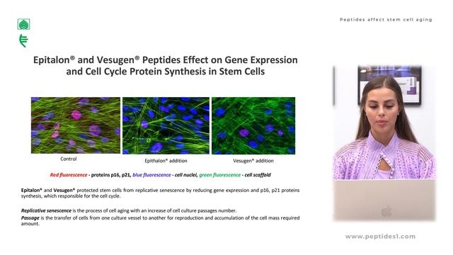 Presentation topic: Peptides affect stem cell aging Speaker: Ekaterina Sergeevna Mironova — candidate of Biological Sciences, Senior Researcher at the Laboratory of Molecular Mechanisms of Aging of the Department of Biogerontology at the St. Petersburg Institute of Bioregulation and Gerontology