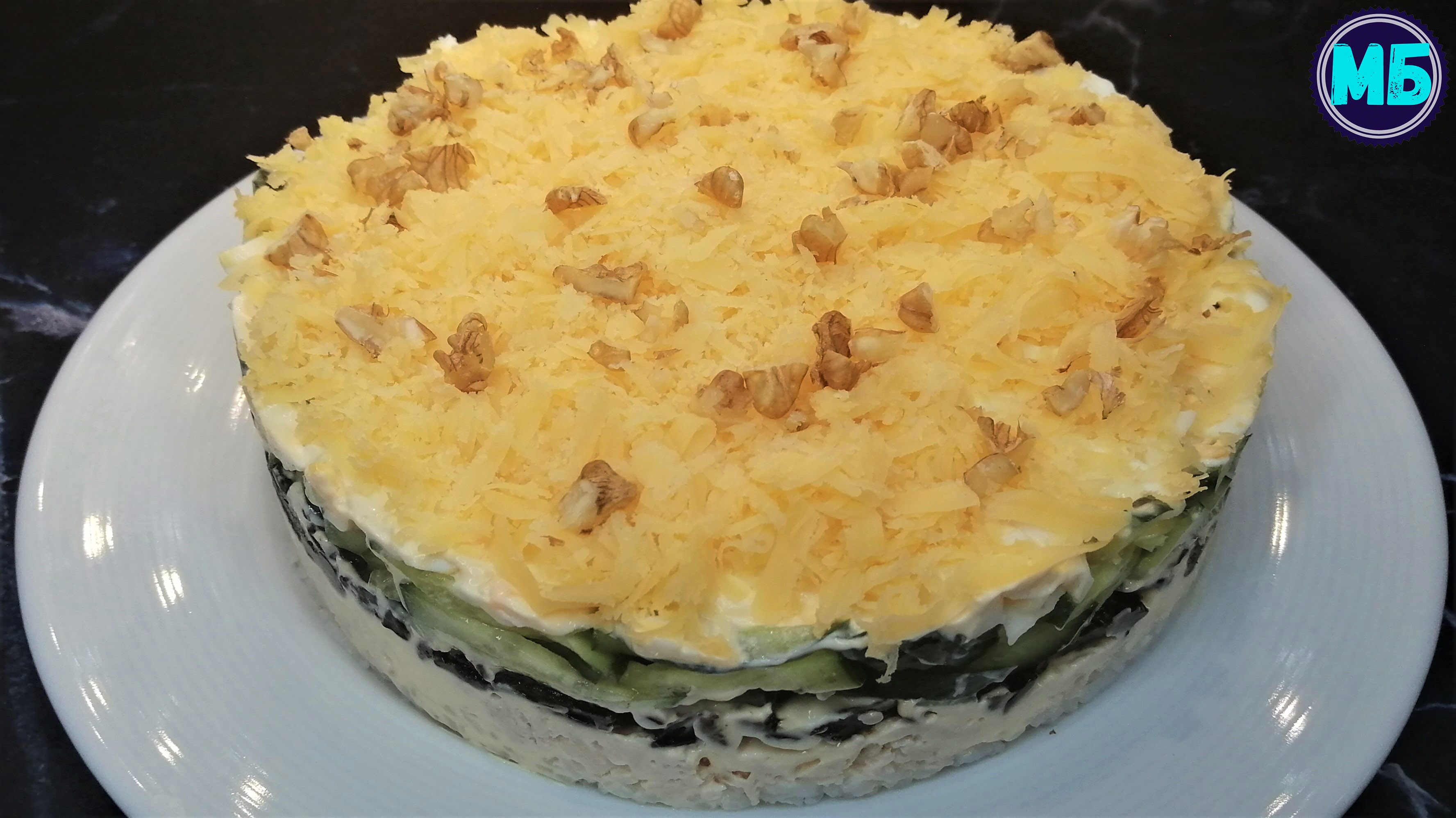 Яйца 4 шт. сыр 100 гр. огурцы 2 шт. чернослив 80 гр. майонез 90-100гр. грецкие орехи 20-30 гр. куринная грудка 300 гр. отваренная с 0.5 ч.л.соли рис круглозерный 80 гр. отваренный с 0.5 ч.л.соли