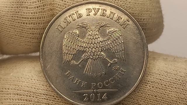 Смотрим на верхний угол цифры 5. Монета 5 рублей 2014 года.
