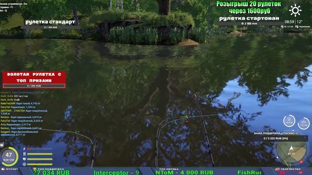 Поддержка донатом https://new.donatepay.ru/@1032463 Альтернативный донат https://www.donationalerts.com/r/kalyamba11 5536913964533059 карта Тинькоф Если стрим лагает,смотри стрим на трово https://trovo.live/s/Kalyamba_na_Ribalke Мой ВК - https://vk.com/kalyantv НИК в игре kalyan11 НАШ ДИСКОРД СЕРВЕР https://discord.gg/4ZzSQkQtsK Заказ водоема на 1 час - 500р ( весь стрим 2500р ) Модерка на канале 1200р ( каждая следующая на 100р больше) Озвучка доната на 40р,50р,100р,200р,300р,500р,1000р ✅Призы в рулетке "ЗОЛОТАЯ" ✔ ЗОЛОТО ✔ ПРЕМ ✔ КАТУШКИ РАПТОР 40, АЗИМУТ 10000, СИЛЬВЕР 80, ТАЙГА с 30 ✔ ПАЛКИ ПИЛКЕРНАЯ, ДОНКА МОРСКИЕ, ✔ РОД ПОД, СТУЛЬЯ ✅Призы в рулетке СТАНДАРТ : ✔ катушка "РАПТОР 40" ✔ катушка "АЗИМУТ 10000" ✔ катушка "ТАЙГА С30, С40," ✔ катушки 60 для медного ( ЭВИИ, НАТОРЫ, ГОЛДА, и тд) ✔ ПИЛКЕРНОЕ УДИЛИЩЕ КОРОЛЕВА ОКЕАНА ✔ Морское Донное удилище ✔ прем ( 3, 7, 30 дней) ✔ золото ( 1, 3, 5, 10, 20 ,50) ✔ билет на море ( 1, 3, 5 дней) ✔ голд наживка и др. ✅Призы в рулетке "СТАРТОВАЯ" ✔ катушка "silver80" ✔ катушка "БЕЛЫЙ КАЛИБР" ✔ катушка "Черный калибр" ✔ катушка "Протон" ✔ катушка "Нарга 6000" ✔ Набор Фидерист и спинингист ✔ Карповик Фортуна ✔ фидерные удилища ✔ прем, золото, алкашка, наживки и тд P.s Рулетка это не казино, а награда за поддержку стримера. Вечный ТОП ПОДДЕРЖКИ (11.05.2024) 1. Dimon_pokemonchik 119 784 2. Interceptor 75 508 3. Skreb79 71 261 4. une personne 68 619 5. Нарвал77 31 550